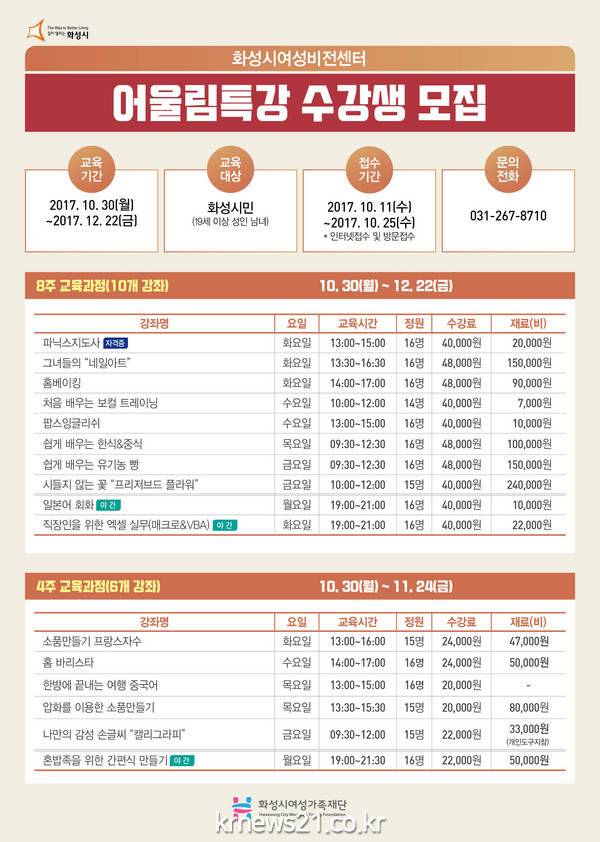 자세한 사항은 화성시여성가족재단 여성비전센터(031-267-8710)로 문의하면 된다.