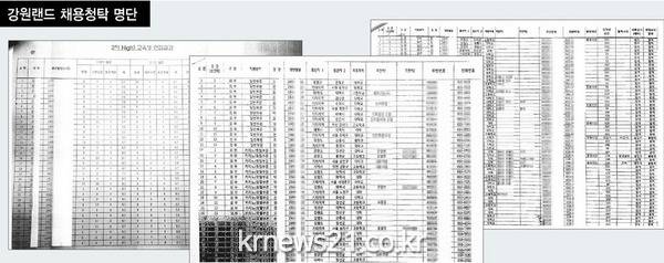 16일 이훈 의원실이 입수한 2012∼2013 강원랜드 신입 채용 청탁자 명단에는 1, 2차 신입 채용 당시의 응시자 각각 427명과 198명에 대한 청탁자 120여 명의 이름과 직책이 표시돼있다. 이 명단은 강원랜드 인사팀이 작성한 것이다. 춘천지검도 이를 지난해 확보해 수사에 활용했다.