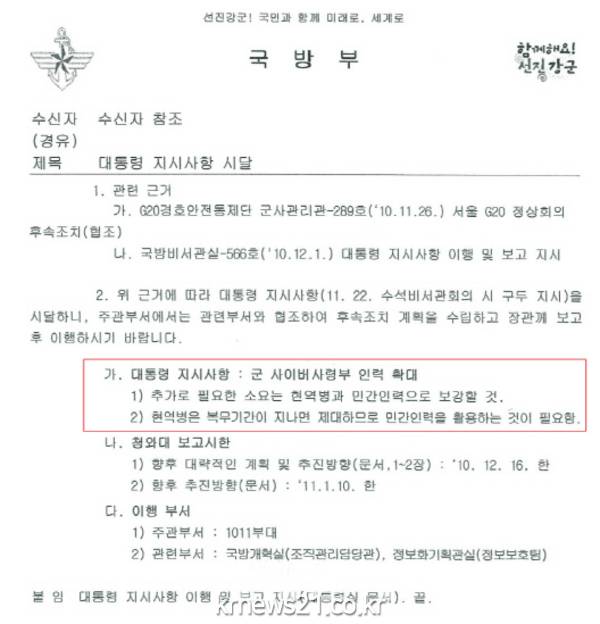 공개된 문건을 살펴보면 국방부 정책관리담당관실은 2010년 12월 2일 사이버사에 ‘대통령 지시사항’으로 ‘군 사이버사령부 인력 확대’를 시달했고 구체적인 방법은 추가로 필요한 소요는 현역병과 민간인력으로 보강할 것과 현역병은 복무기간이 지나면 제대하므로 민간인력을 활용하는 것이 필요하다고 적시했다. 이후 사이버사는 댓글 공작을 주도한 530심리전단에 민간인 출신의 군무원을 대거 채용한바 있다.
