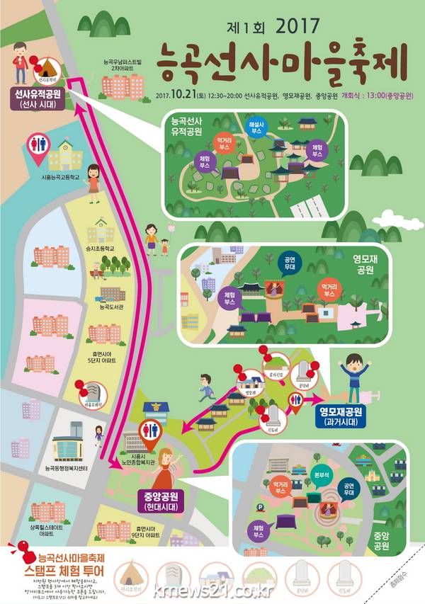 약 6천 년 전의 신석기 유적이 보존되어있는 ‘선사유적공원’, 류자신 선생(광해군의 장인)의 재실이자 시흥에서 가장 오래된 목조건물인 ‘영모재’, 능곡동의 중심인 ‘중앙공원’을 활용한 체험, 전시, 먹거리부스 및 공연, 해설사 프로그램 등 총 116개의 다채로운 프로그램이 준비되어있다.