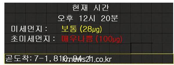 이번 단말기에 제공하는 미세먼지 정보는‘미세먼지’와 ‘초미세먼지’ 이며, 미세먼지 농도에 따라 ‘좋음, 보통, 나쁨, 매우 나쁨’으로 4단계로 나뉘고 세부 농도수치(㎍/m3)까지 표시된다.