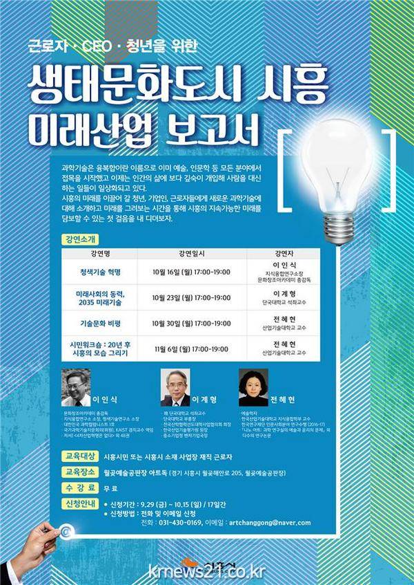 강연은 10월 16일부터 11월 6일까지, 매주 월요일 오후 5시부터 7시까지 총 4회가 진행되며 시흥시민이면 누구나 참여할 수 있다. 전화(031-430-0169)와 이메일(artchanggong@naver.com)로 신청 가능하다.