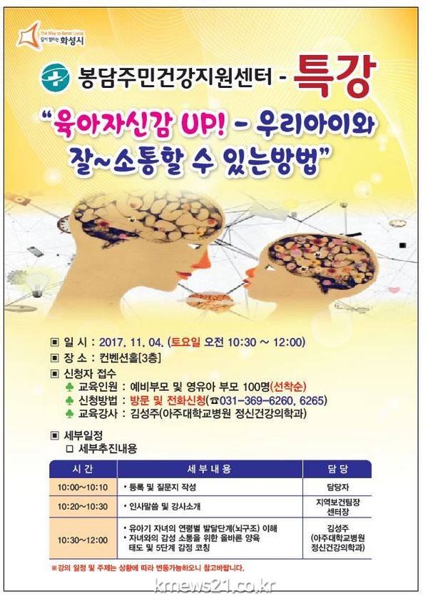 화성시 봉담 주민건강지원센터는 오는 11월 4일(토) 봉담 주민건강지원센터 3층 컨벤션홀에서 영·유아자녀 및 예비부모 100명을 대상으로‘우리아이와 잘~ 소통하는 방법’이라는 주제로 무료특강을 개최한다.