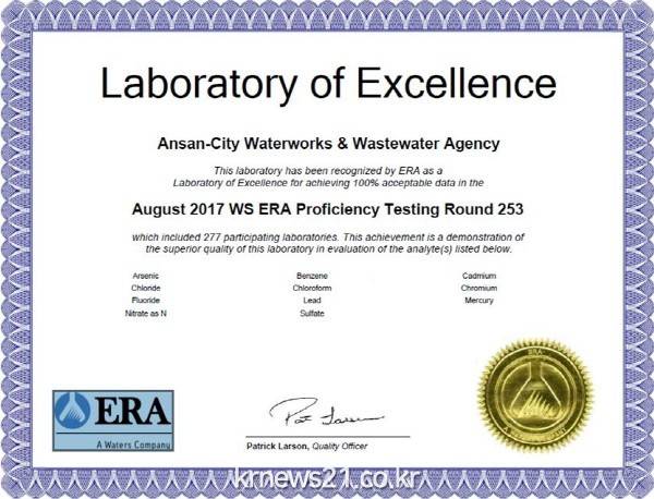 안산시 상하수도사업소(소장 신현석)는 국제 공인 숙련도 시험운영기관(미국 환경자원협회)이 주관하는 먹는 물 분야 숙련도 시험에 참가해 우수기관(Laboratory of Excellence)으로 선정됐다고 밝혔다.