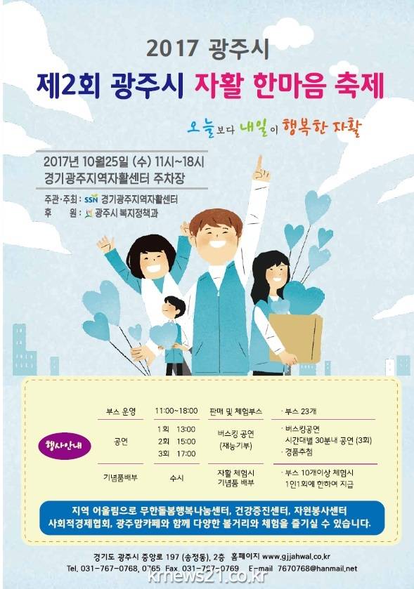 광주시는 오는 25일과 26일 양일간 광주시 상하수도사업소 앞 주차장과 여주지역자활센터 일원에서 ‘제2회 광주시 자활 한마음’를 개최한다고 23일 밝혔다.