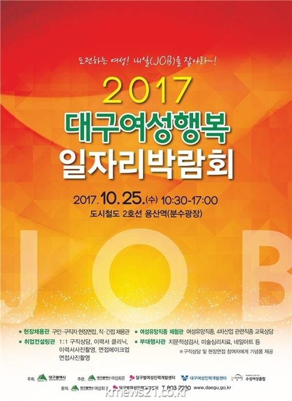 대구시는 지역에 거주하는 미취업 여성들에게 취․창업 기회를 제공하기 위해 오는 25일(수) 오전 10시 30분부터 오후 5시까지 도시철도2호선 용산역(분수광장)에서『2017대구여성 행복일자리 박람회』를 개최한다.