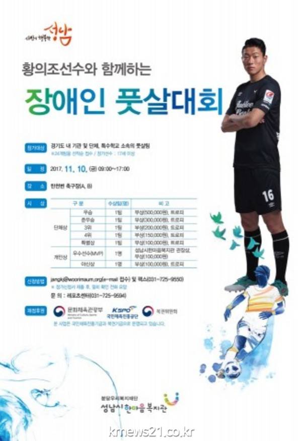 성남시 한마음복지관(관장 이정주)은 11월 10일 오전 9시 탄천변 축구장에서 ‘황의조 선수와 함께하는 장애인 풋살대회(이하 풋살대회)’를 개최한다고 밝혔다.