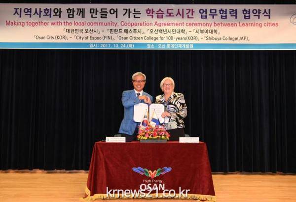 오산시(시장 곽상욱)는 24일 오전 핀란드 제2의 도시인 에스포시와 양 시민 간의 이해와 우호를 증진하고 다양한 분야의 협력을 통해 상호 발전을 도모하기 위한 우호 교류 협약을 체결했다.