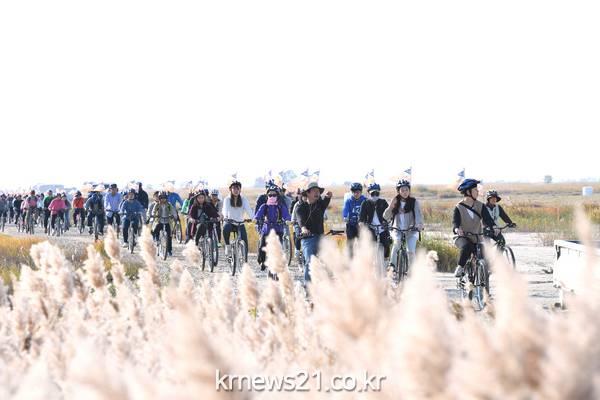 오전의 문학특강과 당성(마산포) 답사를 마치고, 오후에는 전국에서 찾아온 참가자들과 함께 어섬에서 시화호 남단을 가로지르는 라이딩을 시작하였다. 김연수 작가와 참가자들은 자전거를 타고 어섬을 출발하여 시화호 남단까지 총 10.5km의 숨은 비경을 만끽하였다. 시화호 남단의 드넓은 초원은 현재 한국수자원공사에서 추진 중인 송산그린시티 개발지로 평소 일반인의 출입이 금지된 곳으로 4천만 평에 이르는 광활한 들판이다. 이곳은 1994년 시화방조제 물막이를 시작한 이래 20여년이 지나는 동안 바다가 육지화 되어가는 과정을 겪고 있다. 칠면초를 비롯한 염생 식물이 소멸해가면서 지금은 무성한 갈대가 오색으로 가을빛에 물들고 있고, 천연기념물 큰고니와 희귀텃새인 검은머리물떼새 등 240여종의 식생이 서식하고 있는 생태보고이다.