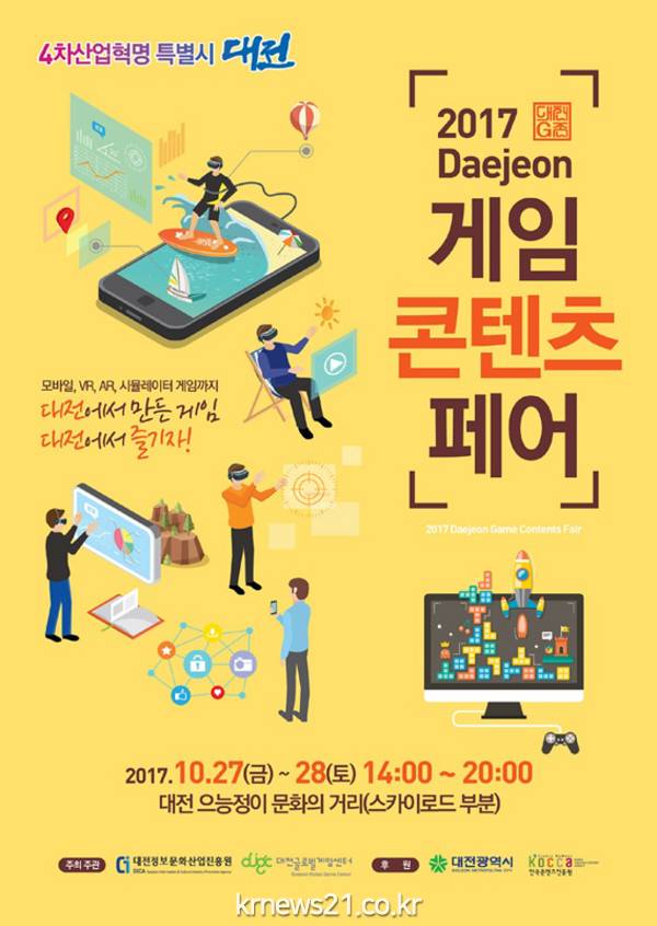 대전광역시(시장 권선택)와 한국콘텐츠진흥원이 후원하고 대전정보문화산업진흥원(이하 진흥원, 원장 박찬종)이 주관하는 ‘2017 대전 게임콘텐츠 페어’가 오는 10월 27일부터 28일까지 양일 간 으능정이 문화의 거리에서 열린다.