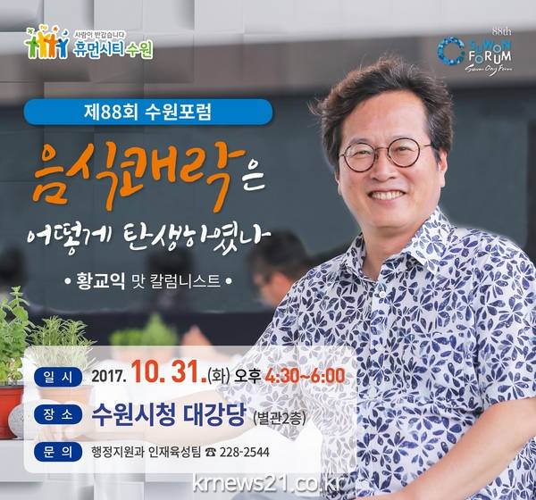수원시는 31일 오후 4시 30분 수원시청 별관 대강당에서 ‘음식쾌락은 어떻게 탄생하였나’를 주제로 제88회 수원포럼을 연다.