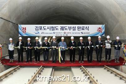 30일 오전 김포공항역 공사현장에서 열린 궤도부설 완료식에는 유영록 김포시장, 노수은 김포시의회 도시환경위원장, 이현정 한국철도시설공단 수도권본부장, 양종대 김포철도사업단장, 노광태 (주)KRTC 토목사업본부 사장, 김석호 서울교통공사 전략사업실장, 서복남 대우건설 토목사업본부장, 이용진 궤도공영(주) 대표이사등 60여 명이 참석해 축하했다.