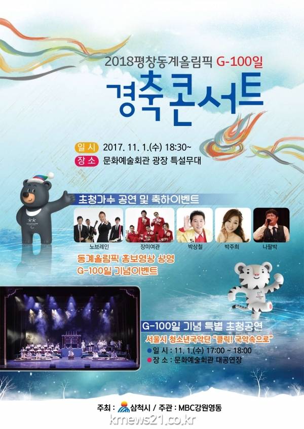 2018 평창동계올림픽 G-100일을 맞이하여 동계올림픽의 성공적인 개최와 붐조성을 위한 '2018평창동계올림픽 G-100일 경축콘서트'가 11월 1일 문화예술회관에서 개최된다.