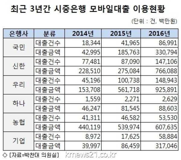 시중은행권의 모바일 대출잔액은 2014년 9천754억원에서 2016년에는 3조1천289억원으로 3배 이상 급증했다. 이용자 신용등급별로는 1등급~7등급까지 분포돼 있었다.