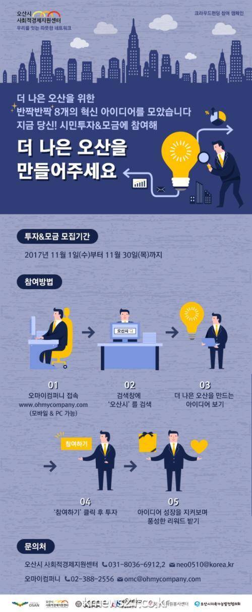 오산시(시장 곽상욱)는 지난 9월 19일부터 10월 11일까지 더 나은 오산시를 위한 참신하고 가치 있는 아이디어을 모집했고 총 12개의 프로젝트 아이디어가 지원해 8개의 아이디어가 선정되었다. 선정된 혁신 프로젝트는 오마이컴퍼니(www.ohmycompany.com)를 통해 시민투자를 받는 크라우드 펀딩을 실시한다.