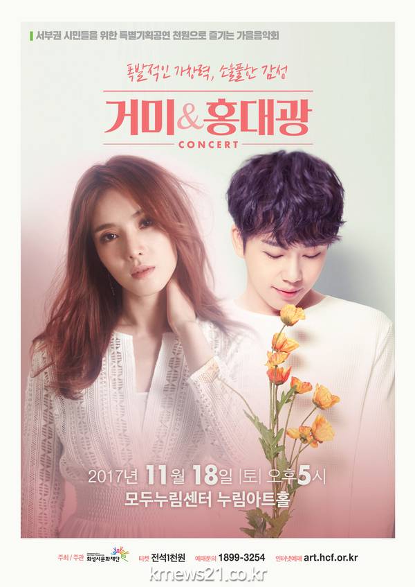서부권 시민들을 위한 특별기획공연 천원으로 즐기는 가을음악회 <</span>거미&홍대광 콘서트>는 2017년 11월 18일(토) 오후5시 화성시청 옆에 위치한 누림 아트홀에서 열리며, 티켓 구매는 11월 2일(목) 오전9시부터 아트홀 홈페이지 및 인터파크티켓 사이트와 전화로 가능하다. 전석 1천원으로 11월9일까지 조기예매 30%할인혜택도 받을 수 있다. 자세한 사항은 누림 아트홀 홈페이지 art.hcf.or.kr 또는 대표전화 1899-3254로 문의가능하다.