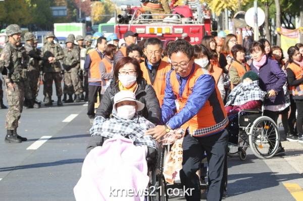 훈련 상황은 배관 용접작업 중 불꽃이 가연물로 옮겨 붙어 화재가 급격히 확대돼 다수의 사상자가 발생한 상황으로 입소 어르신 및 종사원들의 실질적인 대피훈련, 긴급구조통제단 가동에 따른 유관기관별 협업체계 구축, 다수사상자 발생 대비 현장 응급의료소 대응훈련 등을 훈련의 중점 사항으로 진행됐다.
