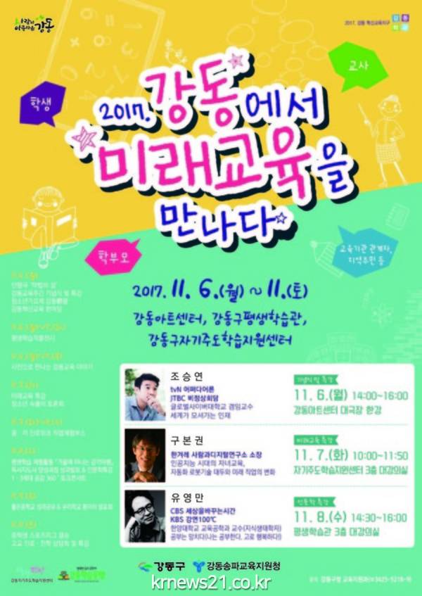 서울 강동구가 오는 6일부터 11일까지를 강동교육주간으로 정하고, 강동아트센터 및 평생학습관, 자기주도학습지원센터에서 강동교육의 결실을 함께 공유하고 즐기는 ‘2017. 강동에서 미래교육을 만나다’를 개최한다고 3일 밝혔다.