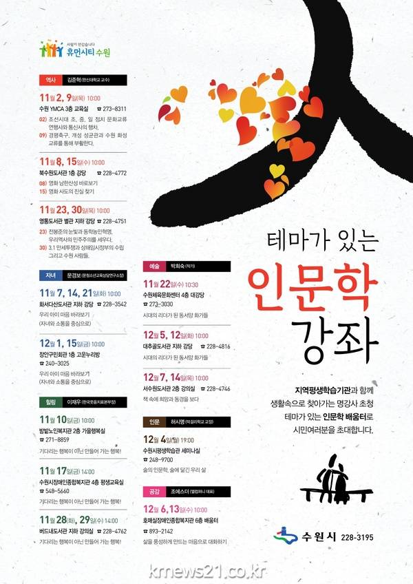수원시 관계자는 “‘테마가 있는 인문학 강좌’는 누구에게나 열려있는 배움터”라며 “인문학 소양을 기르는 데 큰 도움이 될 것”이라고 말했다.
