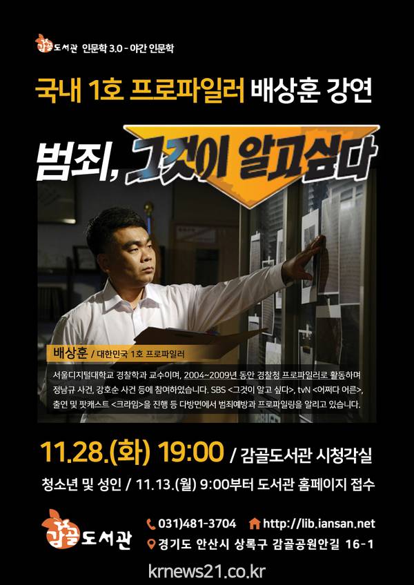 안산시 감골 도서관(관장 서근식)은 오는 28일 오후 7시에 배상훈(프로파일러, 대학교수)를 초청해 ‘범죄, 그것이 알고 싶다’를 주제로 강연을 진행한다.