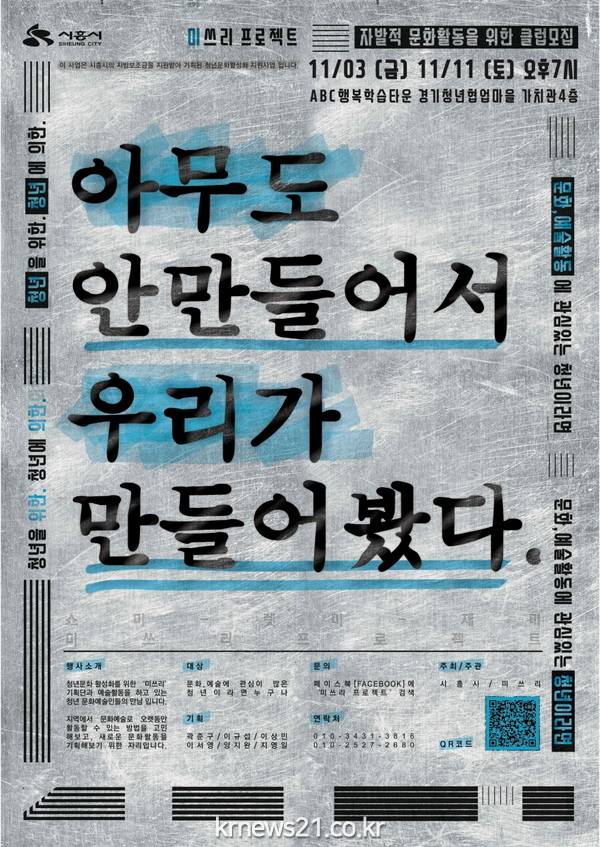 이번 행사는 <2017 </span>청년문화 활성화 지원 사업>에 선정된 팀 중 하나인 ‘미쓰리(대표 이상민)’가 주관하는 문화예술 사업으로 11월부터 본격적으로 시작된다.