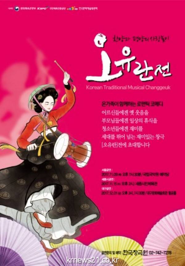 한국 전통공연예술의 발전을 위해 앞장서온 전문예술단체 한국창극원(대표 박종철)의 재미있는 창극 <오유란전>이 11월 9일 국립국악원 예악당을 시작으로 11월 15일 세종시민체육관, 12월 1일 대구문화예술회관 팔공홀 등 전국 무대에 오른다.