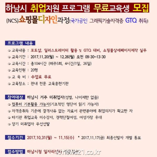 경기 하남시가 관내 미취업자를 위한 취업교육의 일환으로 오는 20일부터 내달 26일까지 ‘2017 취업지원 프로그램(웹 디자인 & 쇼핑몰 관리 과정)’을 진행한다.