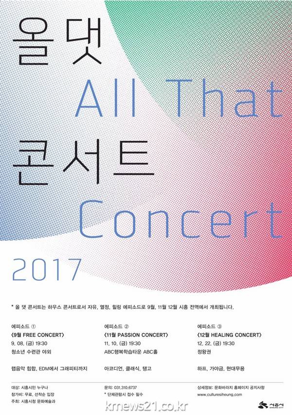 시흥시(시장 김윤식)는 9월 첫째 주, 가족단위 시민 400여 명이 참석한 가운데 자유 에너지를 가득 담은 랩 음악 힙합, 일렉트릭 음악, 그래피티 라이브 페인팅 퍼포먼스로 구성된 <</span>올 댓 콘서트> 중 첫 번째 에피소드 <</span>자유 콘서트> 공연을 성공리에 진행하였다.