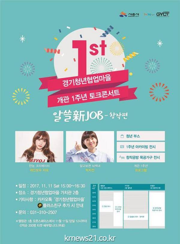 오후 3시부터 4시 30분까지 창작·창업의 놀이터라는 협업마을의 슬로건에 맞춰서 창작에 대한 이야기를 유명 연사과 청년들이 함께 나눌 수 있는 토크콘서트 알쓸新JOB이 진행된다. 창작 계열 파워블로거로 알려진 레인보우 지숙과 유쾌한 아이디어를 구상하는 개그우먼 박지선이 출연한다. 해당 행사의 입장료는 무료이며 당일 12시부터 열림관 1층 오픈스페이스 A에서 선착순 200명에게 티켓을 배부한다.