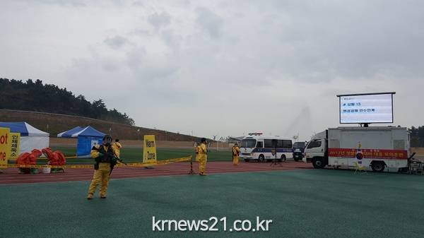 이날 모의훈련은 다중이용시설인 신안공설운동장에 인명살상과 사회혼란을 야기할 목적으로 생물테러로 의심되는 백색가루가 살포되는 상황을 가정한 시나리오로 진행 되었으며,