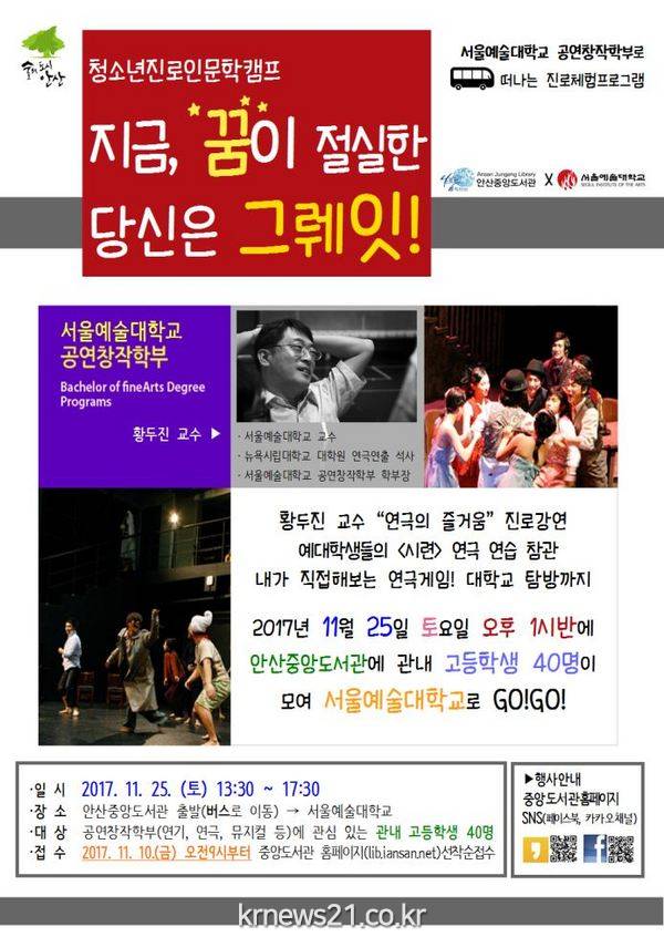 안산시 중앙도서관(관장 우호덕)은 오는 25일 관내 고등학생을 대상으로 청소년 진로 인문학 캠프 [지금, 꿈이 절실한 당신은 그뤠잇!]을 진행한다.