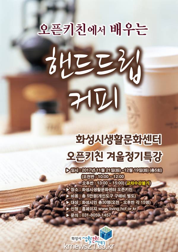 화성시 문화재단 생활문화 팀은 겨울시즌을 맞이하여 오는 11월 21일(화)부터 12월 19일(화)까지 매주 화요일 총 5회에 걸쳐 화성시 생활문화센터에서 「오픈키친에서 배우는 핸드드립커피」 특강을 진행한다.