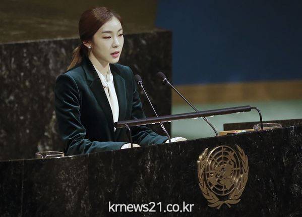 2018년 평창 동계올림픽 홍보대사인 ‘피겨 여왕’ 김연아(27)가 14일(한국시간) 유엔 무대에서 평화의 메시지를 전달했다. 김연아는 이날 미국 뉴욕 유엔본부에서 열린 제72차 유엔총회에 ‘특별연사’로 연단에 올랐다.