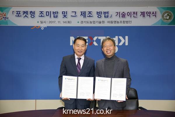 경기도농업기술원은 14일 간편하게 먹을 수 있는 포켓형 조미 밥(가칭) 제조기술을 미듬 영농조합법인에 이전했다고 밝혔다.