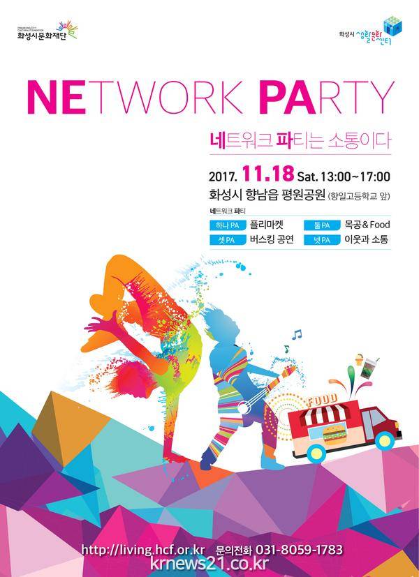 화성시 문화재단(대표이사 권영후)에서 주최하는 「2017 화성시 생활문화센터 네트워크파티」가 11월 18일(토) 오후 1시부터 향남읍 평원공원(향일고등학교 앞)에서 개최된다.