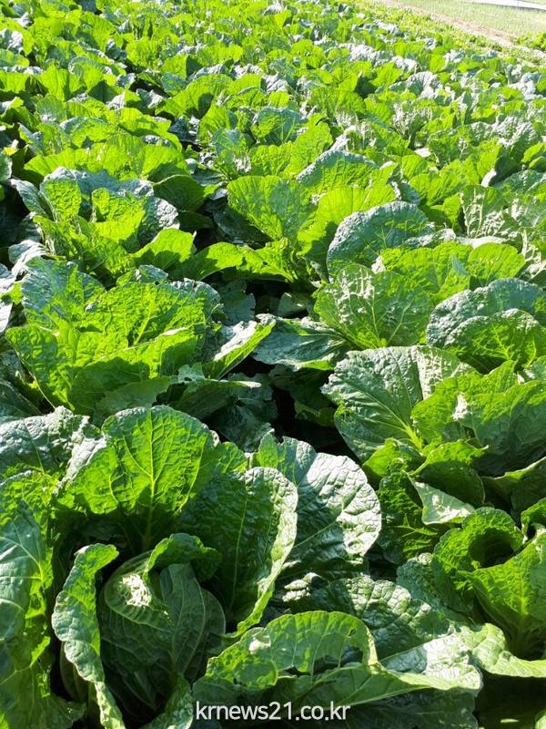 신안군 자은면 여성단체협의회(회장 박승임)에서 지난 9월 15일 고장리 360-1번지외 1필지에 식재한 모종 2,600여개가 어른 머리보다 큰 배추로 자라고 있다.