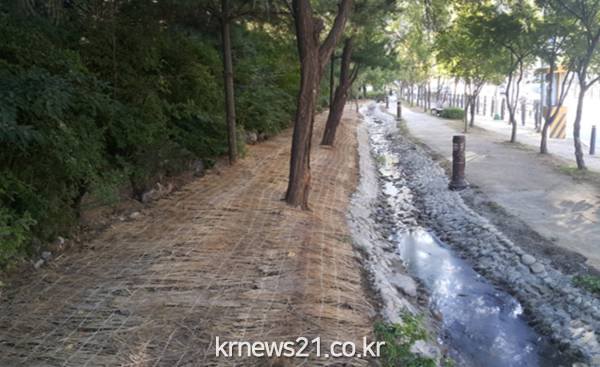 폭이 좁은 자연형 실개울 구간엔 땅을 파고 차수매트를 깐 뒤 자갈을 덮었고, 폭이 넓은 인공형 실개울 구간엔 기존에 조성된 실개울에 맞춰 개울 바닥에 콘크리트와 자갈로 마무리했다.