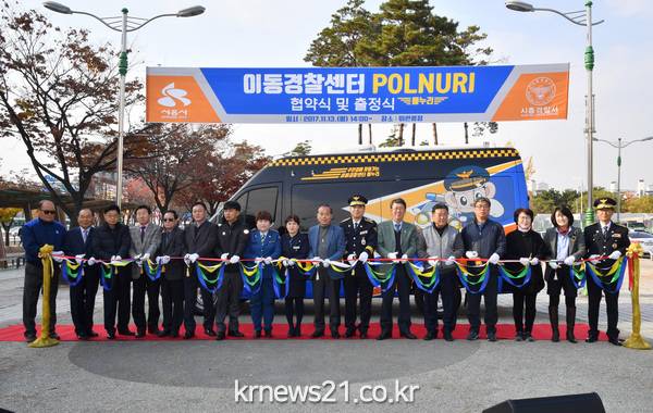 양 기관은 지난 13일 정왕동 미관광장에서 김윤식 시흥시장, 최종혁 시흥경찰서장, 김영철 시의회의장을 비롯해 지역주민 160여 명이 참석한 가운데 이동경찰센터 ‘폴누리’(이하 폴누리) 협약식 및 출정식을 성황리에 개최했다.