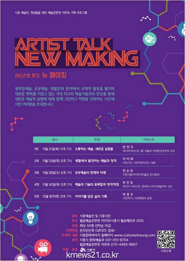 시흥시(시장 김윤식)는 월곶 예술 공판장_Art Dock에서 융, 복합예술, 공공예술, 생활문화 분야에서 국제적 활동을 펼치며 새로운 변화를 이끌고 있는 국내 최고의 예술가들과 시흥예술인들의 만남을 통해 새로운 예술적 실험에 대해 함께 고민하는 아티스트 토크 ‘New Making’을 개최할 예정이다.