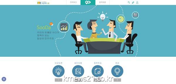 수원시는 20일부터 시범운영하는 ‘수원 시민의 정부’ 온라인 플랫폼 ‘수다플랫폼’(http://www.sooda.or.kr)은 온라인 직접 민주주의를 실현하는 장이 될 것으로 기대된다. 시민들은 수다플랫폼(가칭)을 활용해 시간과 장소에 구애받지 않고 시정에 참여할 수 있다.