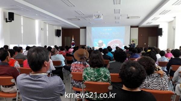 이번 강좌는 단일질환 사망원인 1위인 심뇌혈관질환의 올바른 정보제공과 예방관리를 위한 것으로 이날 기초검진, 원진호 내과 원장을 초청해 고혈압 및 당뇨병 등 합병증 예방관리 특강, 미소․친절․청결 교육, 힐링 노래교실 순으로 진행했다.