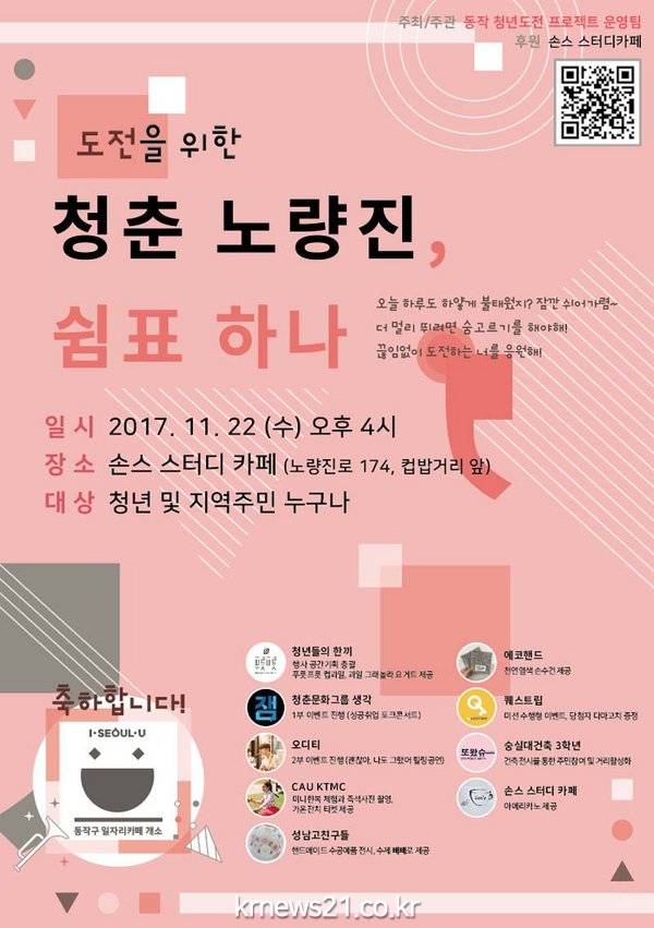 ‘청춘노량진, 쉼표하나’란 주제로 대기업 임원과 공연팀 등 다양한 모임이 참여해 우리시대 젊은이에게 응원의 메시지를 전달한다.