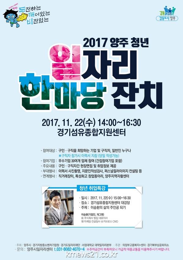 오는 22일 양주시가 경기섬유종합지원센터에서 ‘2017 양주 청년 일자리 한마당 잔치’를 개최한다.