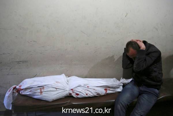 ▲ AFP / Amer ALMOHIBANY[제공자ⓒ 뉴스21통신. 무단전재-재배포 금지.]시리아 반군 지역 카푸르 바트나 동부의 구타(Ghouta)에 마련된 임시병원에서 한 남성이 시신 옆에서 울고 있다. 이 곳에서는 정부군의 공습이 발생했다.