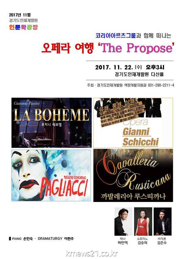 경기도인재개발원이 올해 마지막 인문학광장으로 계절에 어울리는 오페라여행인 ‘더 프로포즈’를 개최한다.