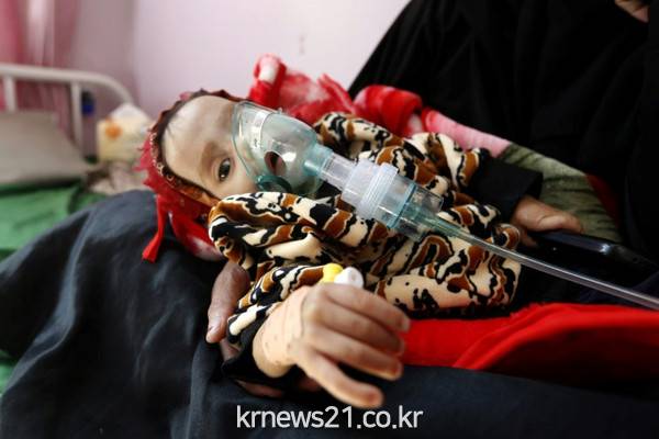 ▲ AFP / Mohammed HUWAIS[제공자ⓒ 뉴스21통신. 무단전재-재배포 금지.]예멘 수도 사나(Sanaa)의 한 병원에서 영양 실조로 고통받는 아이가 지원을 기다리며 치료를 받고 있다. 예멘은 오랜 내전과 올해 4월 창궐한 콜레라로 700만 명이 아사 위기에 놓였다.