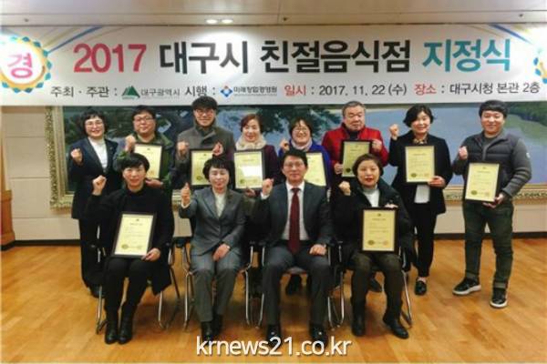 대구시는 '친절한 대구음식점 만들기'를 위해 2011년부터 매년 친절음식점을 지정하고 있다. 올해도 구청장, 군수, 관련단체의 추천을 받은 업소와 기존 지정업소를 면밀하게 심사해 지정기준에 적합한 업소 50개소를 2017년도 대구 친절음식점으로 지정했다.