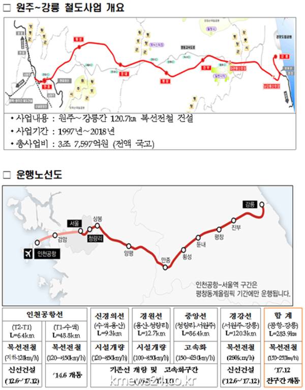 아울러 이번 원주~강릉 철도는 평창 동계올림픽의 기간 수송수단 역할은 물론, 주말이나 명절의 만성적인 강원권 도로정체 해소에도 크게 기여할 것으로 전망된다.