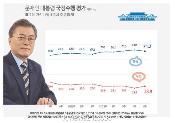 여론조사 기관 리얼미터가 tbs 의뢰로 27~29일 조사해 30일 발표한 11월 5주차 주중동향 여론 결과에 따르면 문 대통령 국정수행 지지도가 전주 대비 1.8%p 내린 71.2%(매우 잘함 48.5%, 잘하는 편 22.7%)를 기록했다.