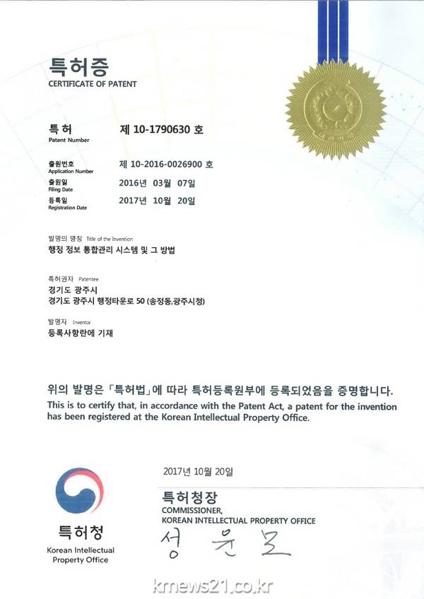 광주시(시장 조억동)는 탈루세원 발굴 및 공공재산의 효율적인 관리 시스템인 ‘아이원 세외수입 통합시스템’의 특허등록을 완료했다고 30일 밝혔다.